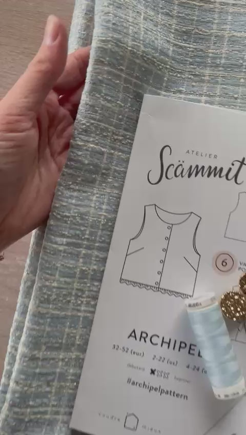 Retrouvez ce kit avec ce dont vous avez besoin pour coudre le top Archipel d'Atelier Scammït dans notre jacquard imprimé Augustin.